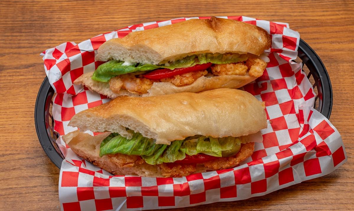 Our Shrimp Po' Boy is stuffed with spicy, crispy french fried prawns and topped with lettuce, tomato, dill pickles, and mayo.