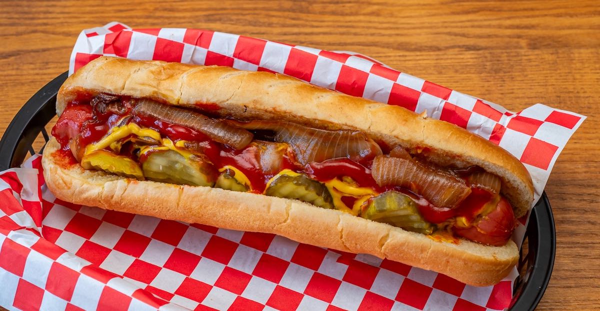 A Chicago-style all beef hotdog on an Italian Bun with mustard, ketchup, sweet pickles, and grilled onions.