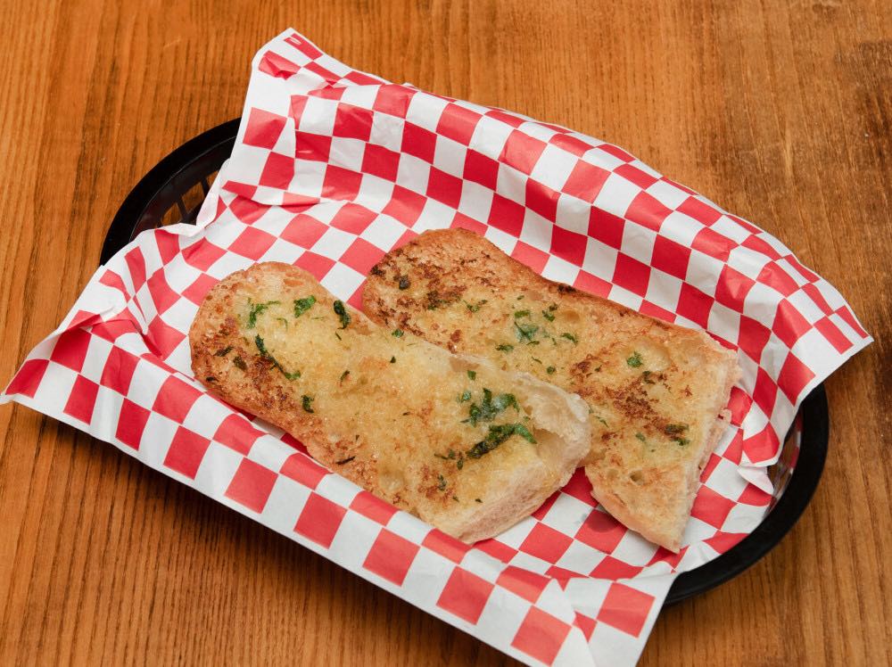 Our homemade bread, toasted with roasted garlic, butter, and flat-leaf parsley and covered with melted mozzarella.
